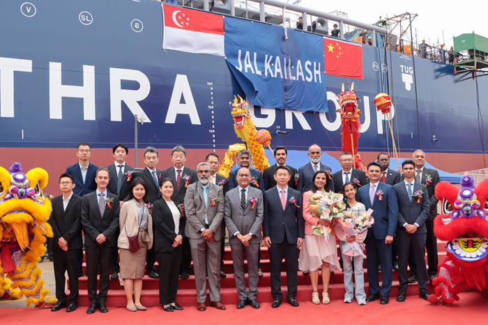 教母Swati Sharma女士命名該船為“JAL KAILASH”輪,隨后命名贊助人Sanjay Sharma先生為新船砍纜、擲香檳禮。鞭炮、禮花齊響,汽笛共鳴。祝福新船、隨船船員航行平安,為船東帶來好運與財富,為勞氏船級社和揚子三井帶來榮譽。