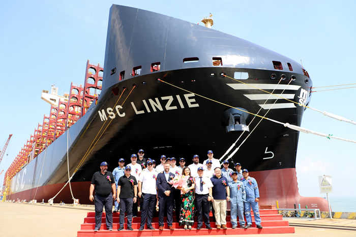 9月4日,我集團(tuán)與地中海航運(yùn)共同為新船舉行了命名祈福儀式。命名人Martyna Orzechowska女士,地中海航運(yùn)新造船部門駐揚(yáng)子鑫?,F(xiàn)場辦經(jīng)理羊海濤先生,我集團(tuán)總經(jīng)理助理兼揚(yáng)子鑫福造船總經(jīng)理?xiàng)钛┫壬餐壣缃幷揪附块T經(jīng)理莊華平先生,以及船東監(jiān)造組、船檢、船廠、船員相關(guān)人員代表及嘉賓出席了儀式。命名人Martyna Orzechowska女士將新船命名為“MSC LINZIE”輪,為新船砍纜、擲香檳禮、拉響汽笛,并與船長共同在新船畫框上署名留念,祝福隨船船員航行平安,為船東和租家?guī)順s譽(yù)和財(cái)富。